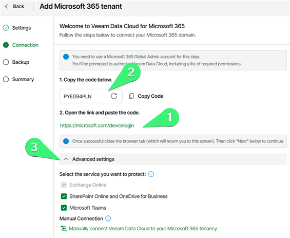 Agora é o momento, de fato, de fazer a integração do VDC com o nosso tenant. Basta copiar o código que é exibido (2), clicar no link (1) e inserir as credenciais de um usuário que seja Admin Global do Microsoft 365 nesse tenant. Se clicarmos em “Advanced Settings (3)“, podemos escolher quais serviços vamos proteger. O Exchange Online já vem marcado e não é possível desmarcá-lo.