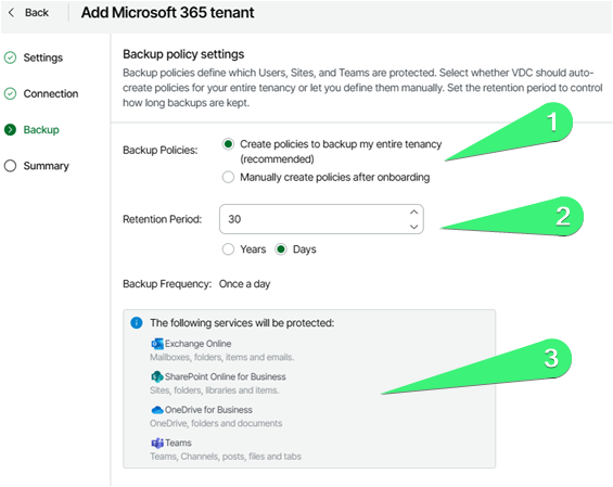A próxima tela nos guiará para definição da política que será aplicada. Aqui podemos escolher se vamos proteger o tenant todo ou se faremos a criação manualmente das políticas (1) após processo de onboarding. Também definimos aqui o período de retenção (2) e quais os itens que serão protegidos (3).